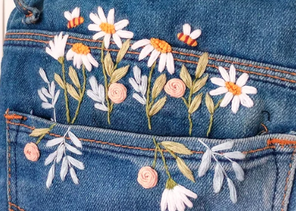Many jean manufacturers focus on embroidering the back pocket of the jeans with ’embellishments’ like sequins, beads or other three dimensional design features. Here are some adorable ideas for inspiration from etsy: