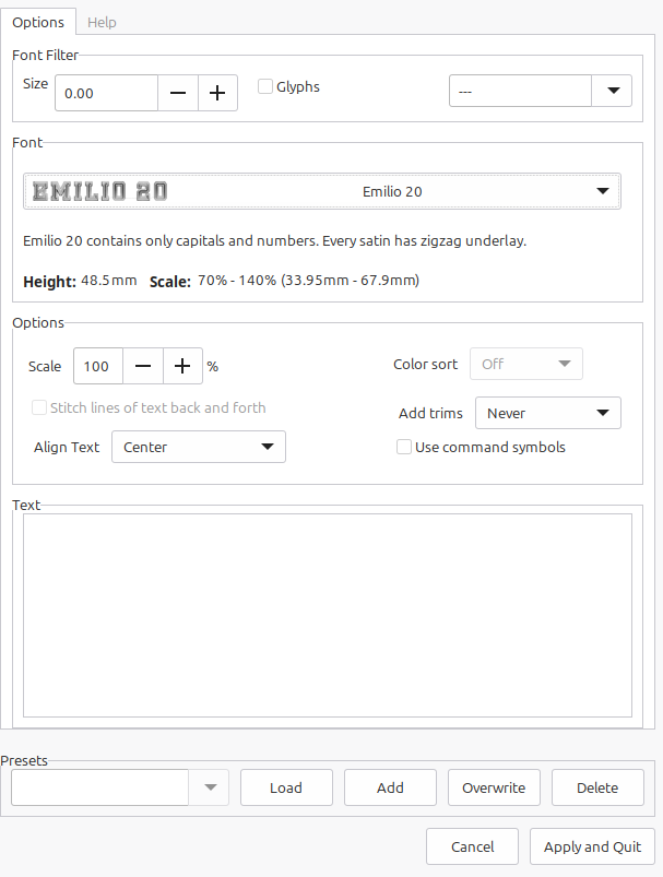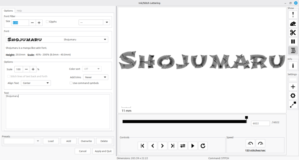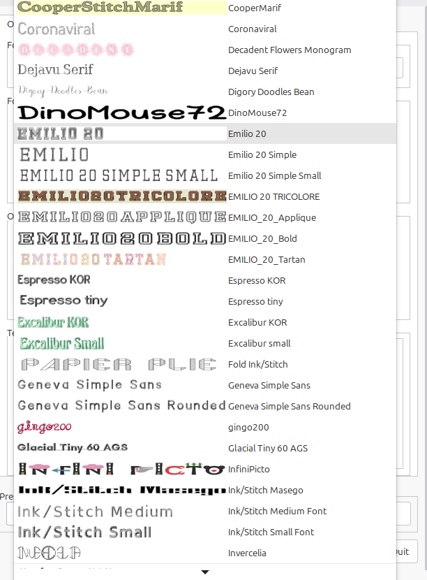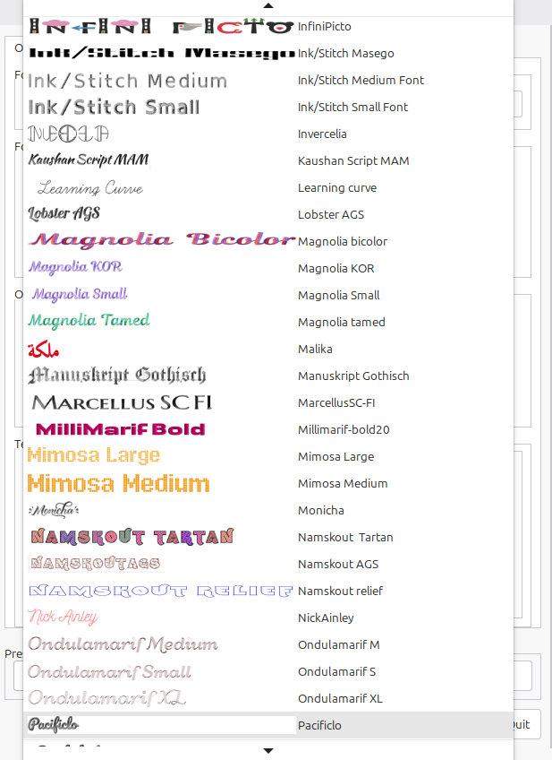 Inkscape makes it easy with satin stitches and other concepts to come alive with their lettering options. To access this section select Extensions, Inkstitch and Lettering. These are not to be confused with ‘fonts’ which may be more numerous but do not have the inbuilt stitching patterns formed as these stitches do. The difference is that you will need to apply embroidery stitch patterns for other fonts that are not on this list wheras here the lettering options are pre-defined and provide a higher chance of success for beginners. Here are the available Lettering options that Inkscape has built in.